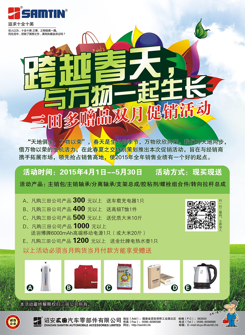 “天地俱生,萬(wàn)物以榮”,春天是生長(cháng)的季節,萬(wàn)物欣欣向榮。我們與天地同步,借萬(wàn)物以榮的生機活力,在此春夏之交特別策劃推出本次促銷(xiāo)活動(dòng),旨在與經(jīng)銷(xiāo)商攜手拓展市場(chǎng),領(lǐng)先搶占銷(xiāo)售高地,使2015年全年銷(xiāo)售業(yè)績(jì)有一個(gè)好的起點(diǎn)。
